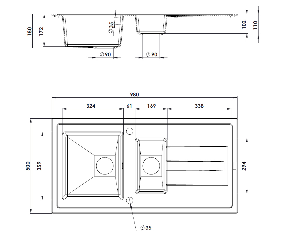 Ihre Maße betragen 98x50x20 cm und sie ist passend für Unterschränke mit 60 cm Breite. Sie wiegt 10,1 kg (nur die Spüle).