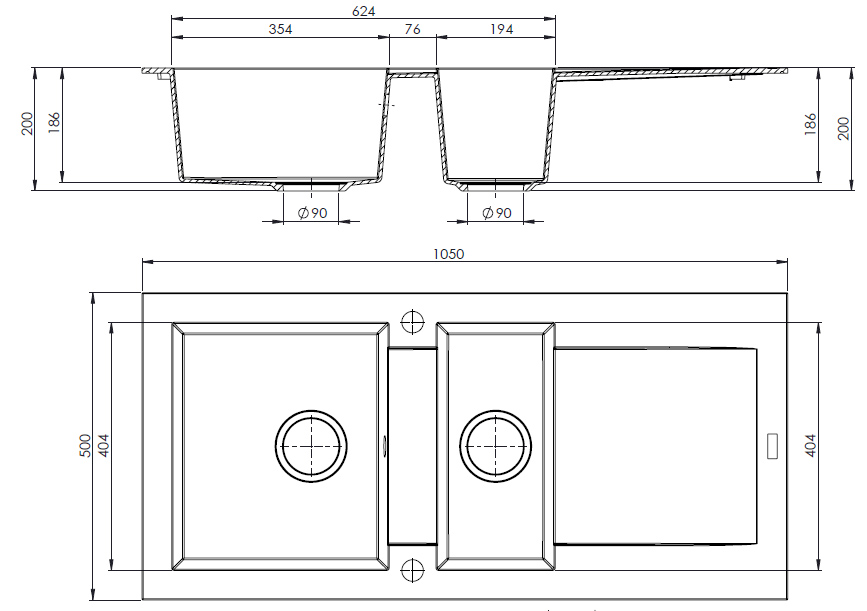 Reversible Spüle mit vorgebohrtem Hahnloch